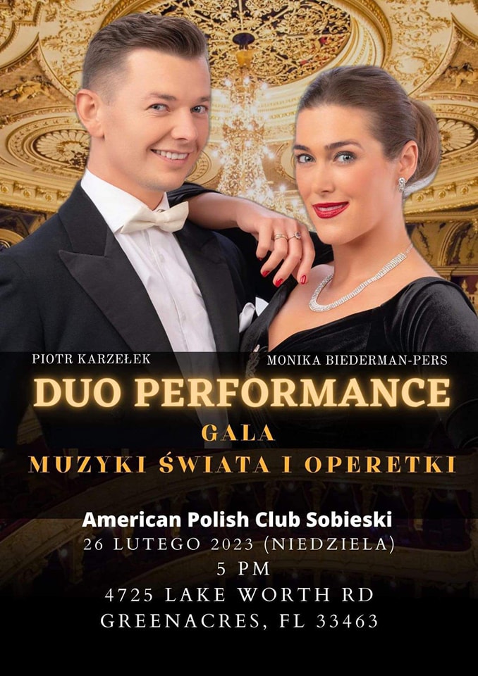 Klub Sobieski i Duo Performance zapraszają na rewelacyjny koncert łączący elementy tańca klasycznego i śpiewu. Wystąpią światowej klasy artyści Monika Biederman-Pers i Piotr Karzełek. Niedziela, 26 lutego o godz. 5 po południu. Sala Balowa.