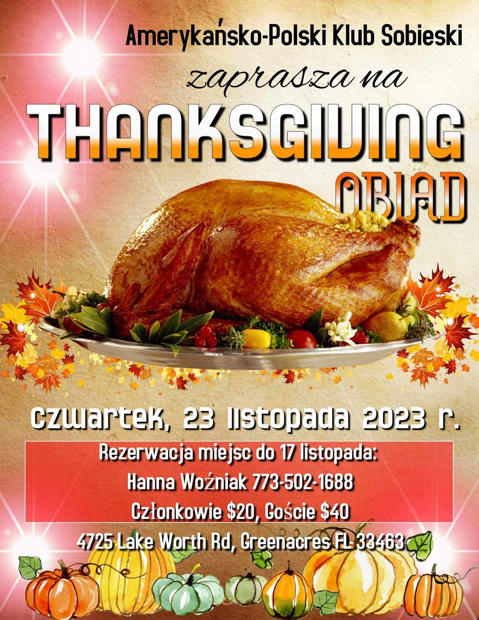 Klub Sobieski zaprasza wszystkich na coroczną ucztę kulinarną z okazji Święta Dziękczynienia, we czwartek, 23 listopada 2023 r., o godz. 4 po południu.